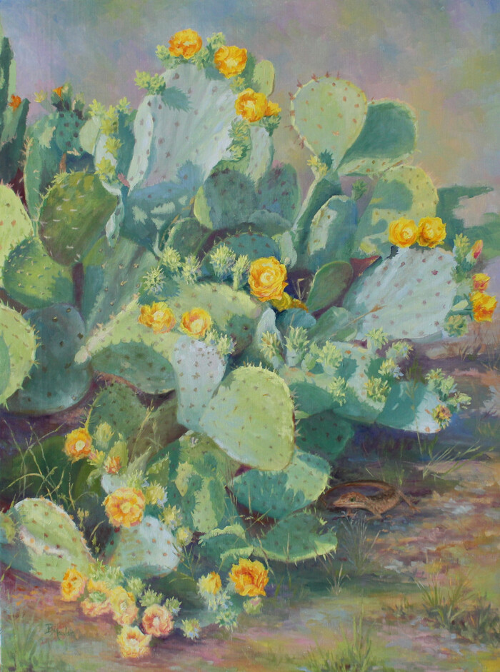 Barbara has focused her attention on the Texas landscape, especially on prickly pear cactus. Cactus is fun to paint. It has a multitude of interesting colors, which are an expression of the harshness of the environment and the amount of direct sun. In spring the colors are lighter and more mellow, and the flowers of late spring are a vibrant yellow and rose, sometimes orange.  She enjoys plein air work, accepting the challenges of color, design, and the environment (critters and weather). Texas abounds with variety and inspiration; there is always another painting just around the corner!